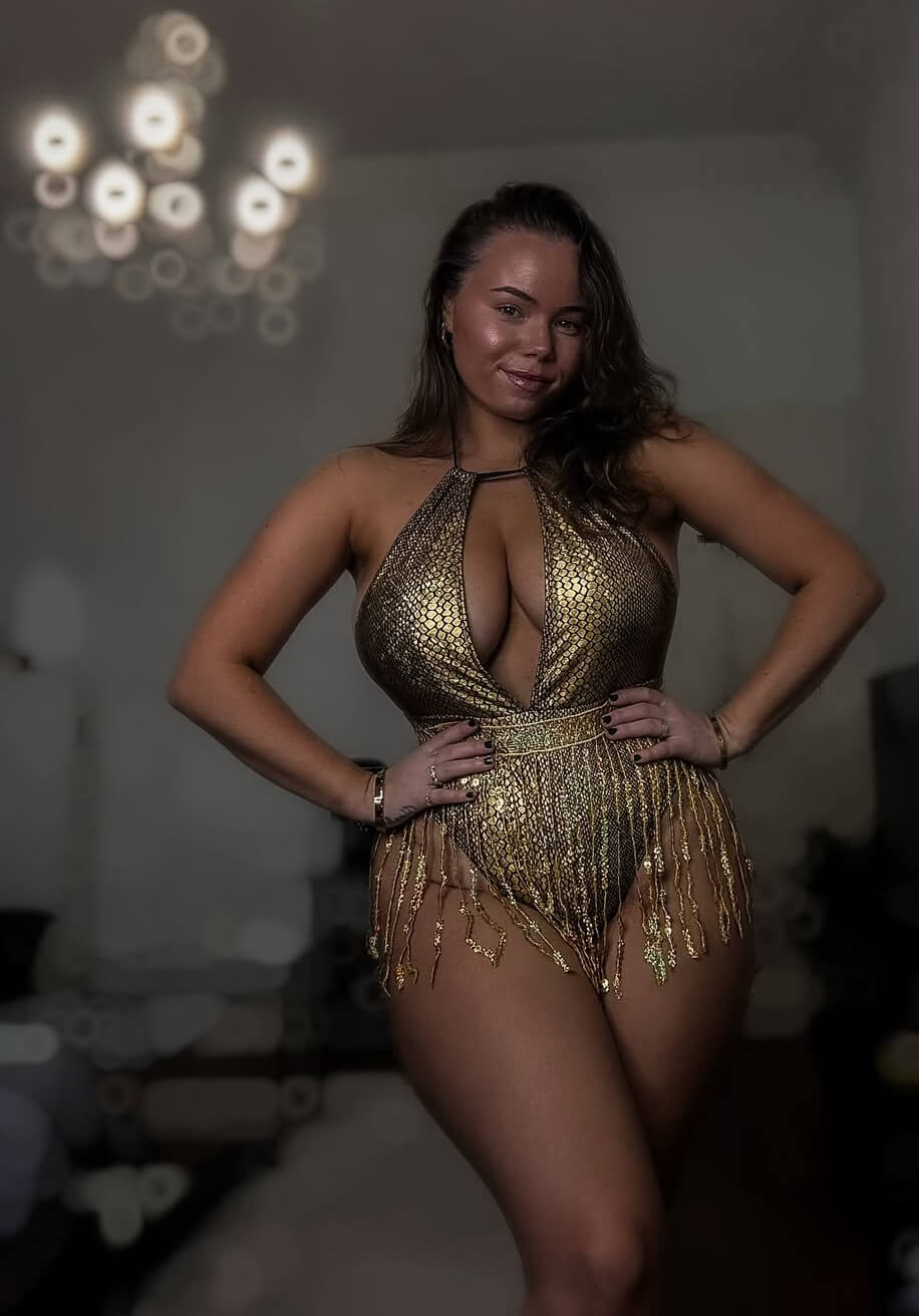 Stick ut i mängden med detta lyxiga festivalset! En ormmönstrad bodysuit med halterneck och stringdesign kombineras med ett knytband prytt av glittrande paljetter som vackert sveper över höfterna. Perfekt för festliga tillfällen där du vill glänsa.