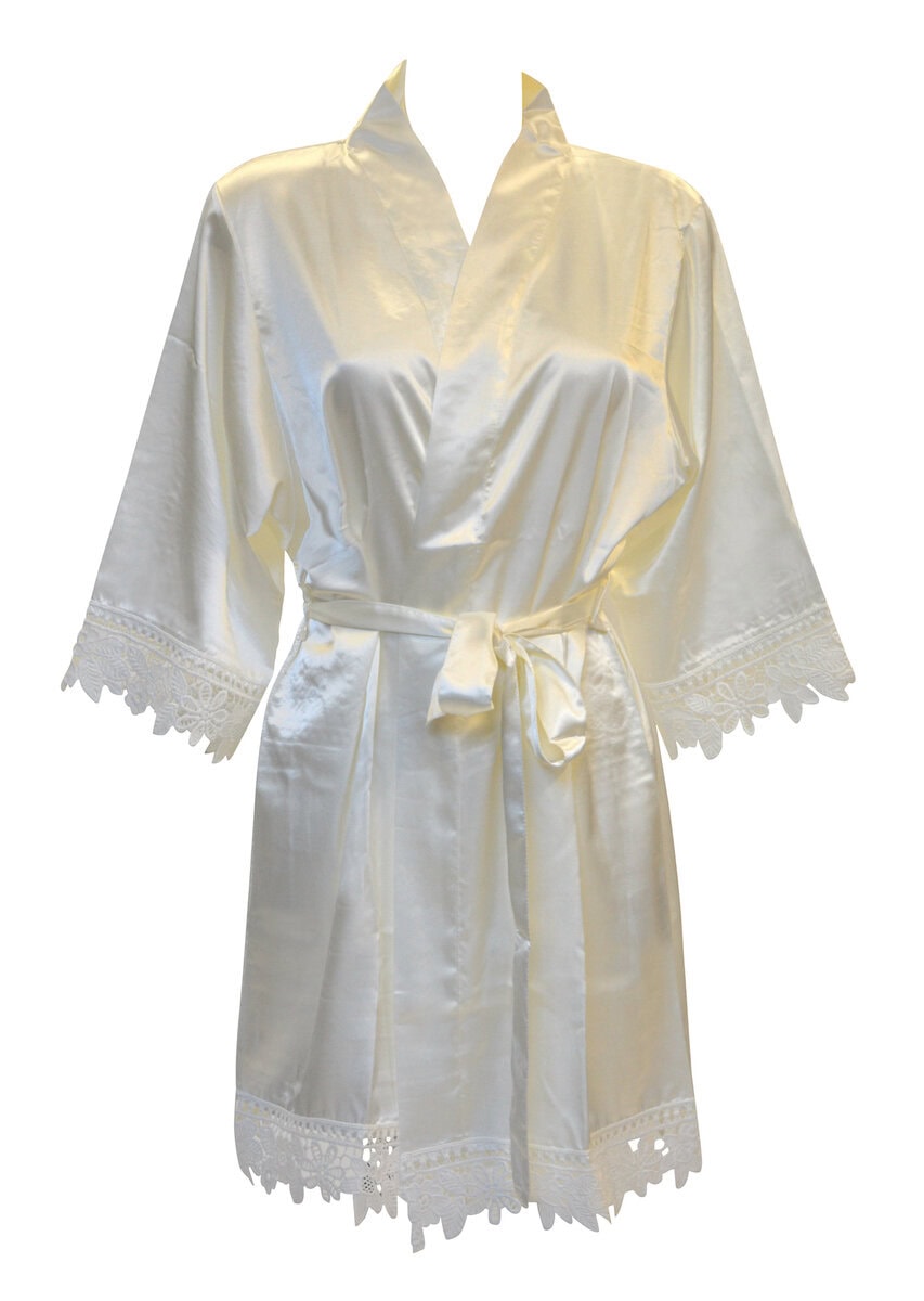 Lyxig och vacker kimono morgonrock tillverkad i en otroligt mjuk och fin silkesimitation, kantad med broderad spets. Morgonrocken har öglor i sidorna till knytbandet i midjan, vilket gör att den även kan bäras öppen. Snygg passform och skön bärkomfort i ett.