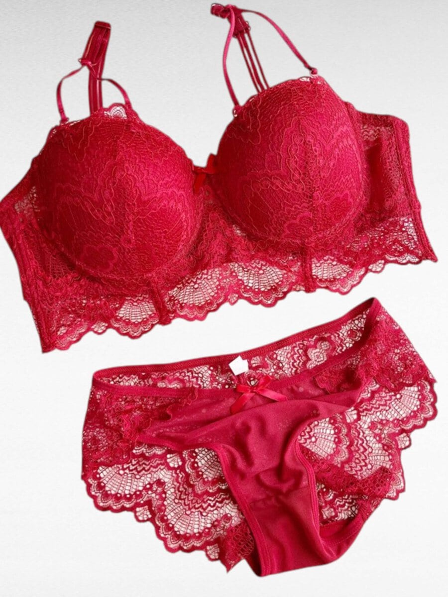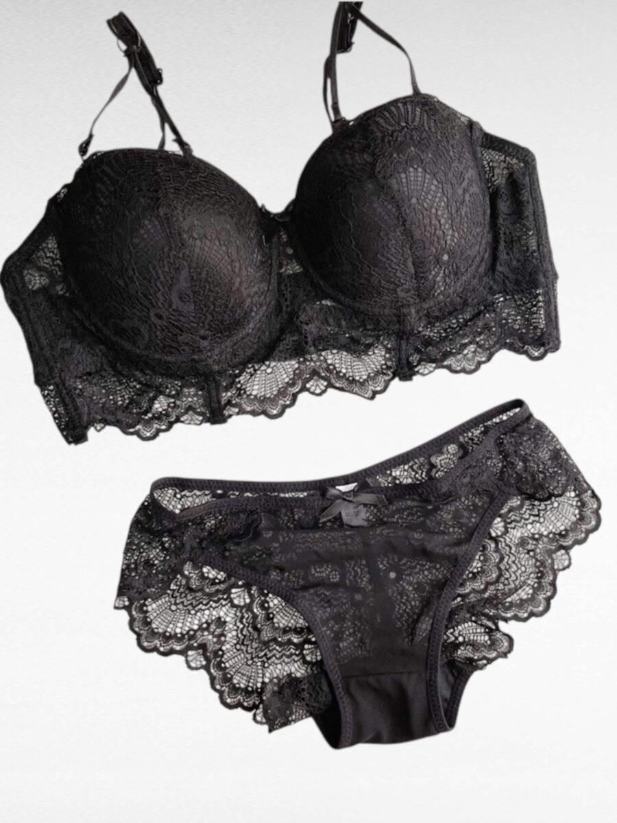 Förföriskt set i spets med push up-bh och matchande trosa. Bygel, avtagbara axelband och dekorativ spets ger både lyft, stöd och elegant stil.